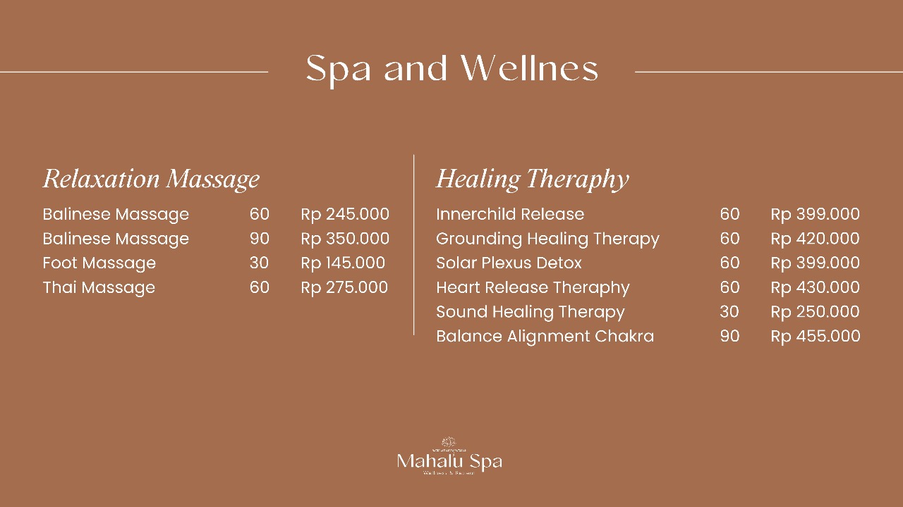Rasakan pengalaman spa holistik dengan sentuhan tradisional Bali. Mahalu Spa menghadirkan keharmonisan antara tubuh, pikiran, dan jiwa melalui perawatan alami yang menenangkan.